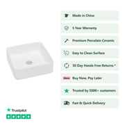 Enhance your bathroom with the Hades 365mm Square Countertop Basin. Made of high-quality porcelain in a sleek gloss white finish, this basin adds a touch of modern elegance. Its compact size is perfect for smaller bathrooms. Waste and tap not included.