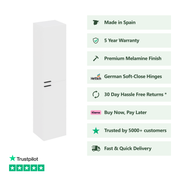 Crafted from durable 16mm particle board with lacquered edges and 19mm door fronts, the cabinet ensures both long-lasting performance and refined style. The adjustable wall hanging system provides stability and ease of installation, while the 300mm high-capacity doors in the smooth Blanco Brillo finish deliver ample storage for your bathroom essentials.