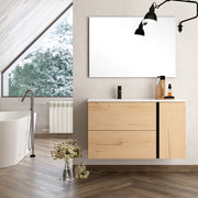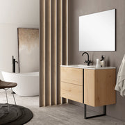 The Evora Wall Hung Vanity Unit in Natural Oak combines elegant woodgrain texture with modern bathroom functionality. Featuring a premium prebuilt carcass, soft-close drawer and door, and sleek Matt Black Handles, this vanity is a sophisticated space-saving solution. Designed with an offset Lira Basin (Left Side Sink) for added functionality, it offers versatile storage and contemporary appeal. Optional black designer leg available for added style and support.