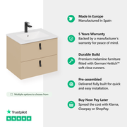 The Invicta Wall Hung Vanity Unit in Cashmere adds soft sophistication to any bathroom. Constructed from a durable 16mm moisture-resistant melamine-faced board with a premium 19mm lacquered drawer front, this sleek unit features Matt Black Handles and offers versatile basin compatibility. Choose between Lira, Athena, or Veneto porcelain basins, or opt for a matching worktop—perfect for pairing with a countertop basin like the Zeus.