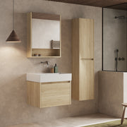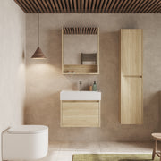 The Mino Wall Hung Vanity Unit in Natural Oak is designed for both style and performance. Its inset handle design creates a clean, contemporary look while offering easy access to storage. Built with metal drawer insert, the unit is resistant to water damage and daily wear, ensuring long-term durability. High-quality Hettich hinges, widely used in demanding environments such as kitchens, provide smooth, reliable operation. Finished in a textured natural oak woodgrain, this floating vanity is available in a range of widths and can be paired with either a porcelain basin or a matching worktop for countertop basin setups.