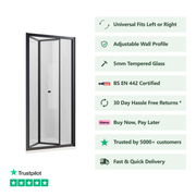 Maximise your bathroom space with the Linea Black Framed Bi-Fold Shower Door – a practical and stylish choice designed to complement modern interiors. Made with 5mm tempered safety glass and enclosed in a bold black aluminium frame, this inward-folding door is perfect for space-conscious bathrooms without compromising on design.